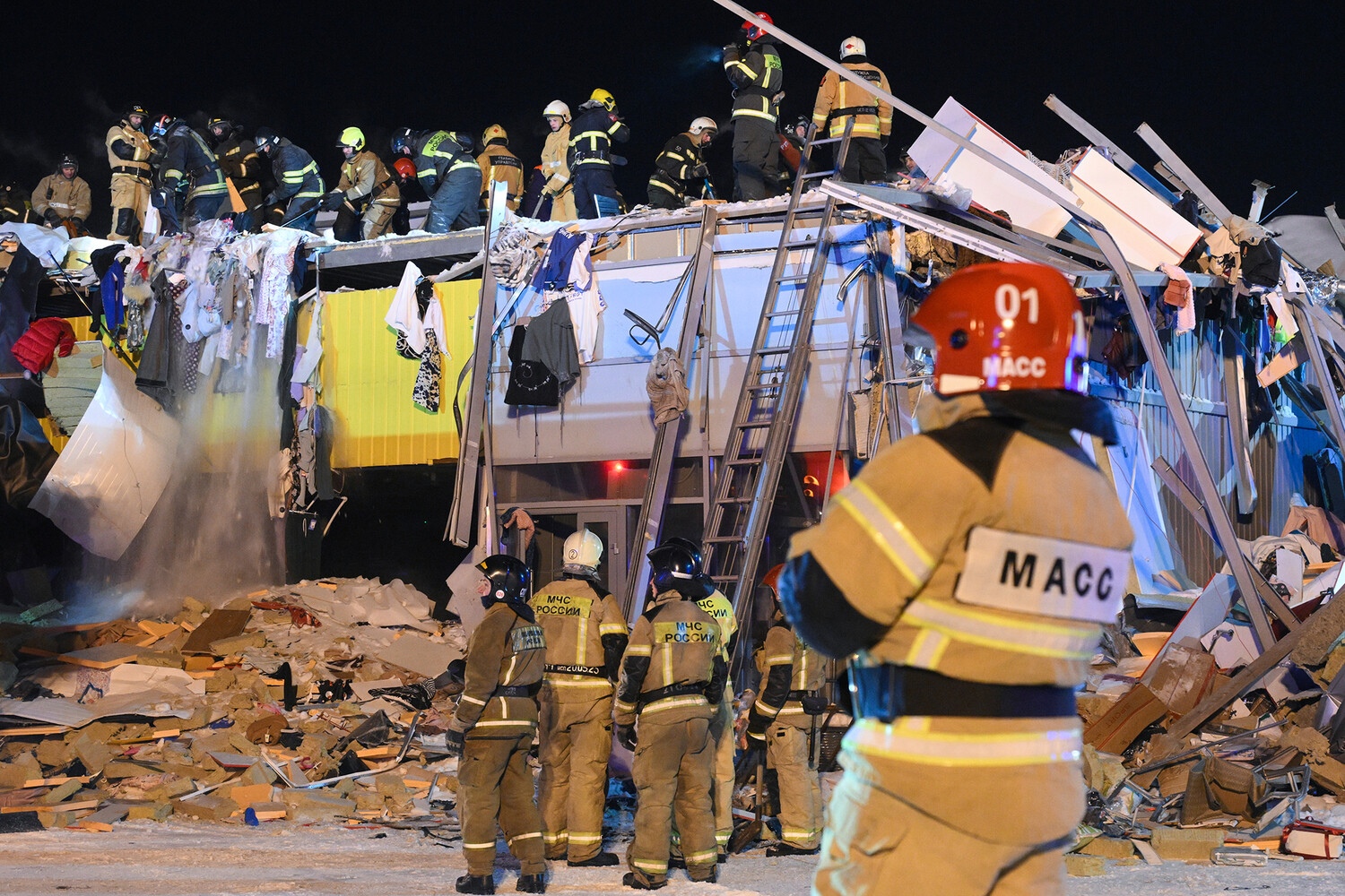 На месте работали более 350 специалистов и около 70 единиц техники. В ликвидации последствий участвовали сотрудники МЧС, Росгвардии, полиции, кинологи, психологи, а также специалисты газовой службы — здание отапливалось газом, поэтому существовал риск утечки. Спасатели применяли бензорезы для резки металлоконструкций, подъемные краны и другую тяжёлую технику для разбора завалов. С воздуха ситуацию координировали беспилотники. Периодически объявлялись минуты тишины, чтобы услышать возможных оставшихся под завалами людей.